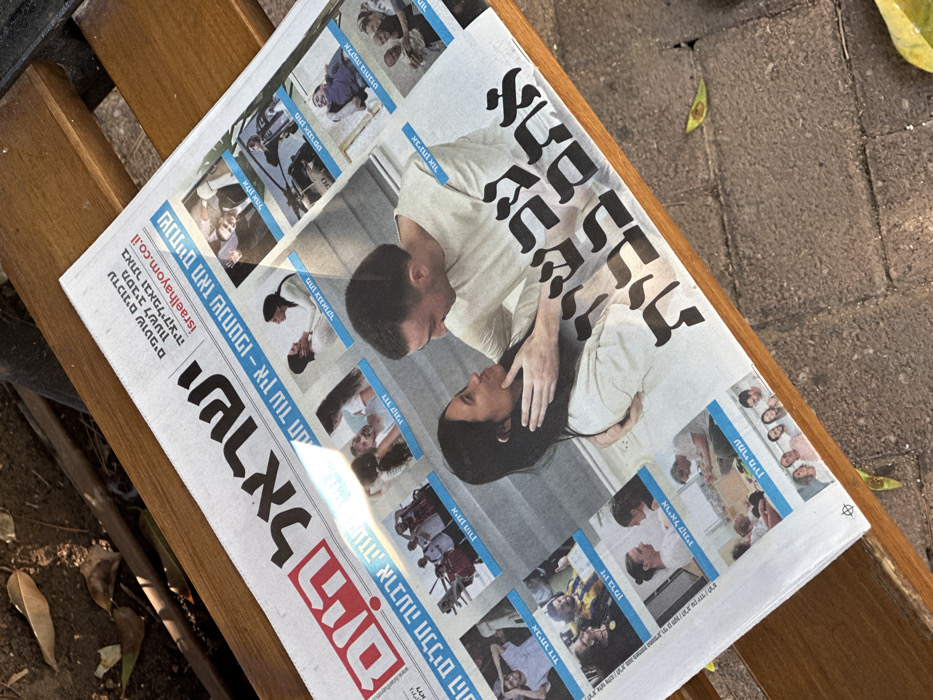 A single copy of the Hebrew newspaper "ישראל היום" (Israel Hayom) rests diagonally on a slatted wooden bench