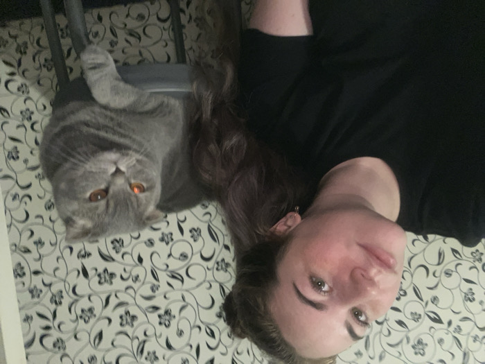 The scene depicts an indoor environment in Chaikovsky, Russia, featuring one female individual and one cat. The woman, positioned on the left side of the frame, is shown from the chest up, facing the camera. She has light skin, long brown hair, and is wearing a black short-sleeved top. A small, circular earring is visible in her right ear. Her expression is neutral. To her right, a grey Scottish Fold cat with folded ears is seated on a dark-colored, possibly black, stool. The cat's eyes are amber, with its left eye exhibiting a prominent red-eye effect, indicative of flash photography. The background consists of a wall covered in wallpaper with a repeating pattern of dark, stylized floral or scroll motifs on a light-colored ground. The lighting appears artificial.