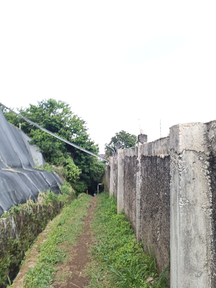 This image depicts a narrow, unpaved dirt pathway in Koipa, Papua New Guinea, viewed from a low angle under an overcast sky. The path, approximately 1.5 meters wide, is covered with green grass and weeds and recedes into the distance, appearing to narrow or curve slightly. To the immediate right, a weathered concrete retaining wall runs parallel to the path. This wall, composed of multiple vertical sections or pillars, shows significant discoloration with dark, mottled stains and exposed aggregate textures. Its top edge is irregular, with small metallic rods protruding from various points. To the left of the path, an embankment slopes upward, partially covered by a black mesh or netting material, likely for erosion control. Green foliage and small trees grow on and above this slope. A lower concrete or stone wall forms the base of this embankment, bordering the pathway. Overhead, a single black or dark cable runs diagonally across the frame from the upper left, above the path. Dense green trees and vegetation are visible in the mid-ground, beyond the embankment, obscuring any structures behind them. In the far distance, at the visible end of the path, a faint, light-colored human-shaped figure is barely discernible near a darker, tunnel-like opening or passage. The figure's details, actions, and interactions are indistinguishable due to distance and resolution. A small, orange-red object, possibly a marker or pipe, is visible on the left side of the path further down. The overall lighting is diffused, consistent with an overcast day.