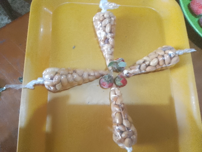 The scene is an indoor setting in Unknown, Unknown. Four clear plastic bags, each filled with shelled peanuts, are arranged radially on a textured yellow rectangular plastic tray, forming a cross-like pattern. Each bag is sealed at both ends with twisted plastic. Three small, red, berry-like objects, some exhibiting green calyxes, are centrally positioned within the arrangement of peanut bags. A portion of a green plate or bowl, containing indistinct reddish items, is visible in the upper right background. The yellow tray rests on a brown, likely wooden, surface. No people are present.