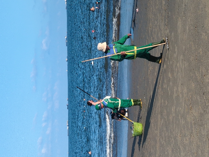 The image depicts a daytime scene on a sandy beach in Quy Nhon Ward, Vietnam. In the foreground, two individuals in green uniforms are engaged in beach maintenance. The individual on the left wears a green long-sleeved uniform with light blue and white accents, dark green pants, and green rubber boots with yellow soles. They stand next to a large, round, green woven basket containing debris and hold a long dark pole. The individual on the right, also in a similar green uniform with light blue and yellow accents, dark green pants, and green rubber boots, wears a light-colored bucket hat and walks from right to left, actively raking the sand with a long wooden pole ending in a flat rake head. Their shadows are visible on the sand, extending towards the viewer's left. In the midground, the ocean features moderate waves breaking on the shore. Approximately 10 to 15 individuals are visible swimming or wading in the water. The background consists of a clear blue sky with scattered white clouds, above a horizon dotted with numerous large cargo ships and smaller vessels on the sea.