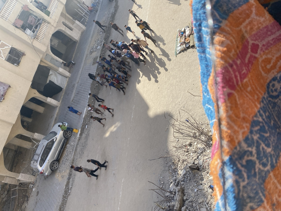The image, captured from an elevated perspective, depicts an outdoor scene in Deir el-Balah, Palestinian Territory, focusing on a street bordered by multi-story residential buildings. The immediate foreground is partially obscured by a colorful, patterned textile in blue, orange, and pink, suggesting the viewpoint is from a window or balcony. The scene below features a wide, unpaved or dirt street area. In the mid-ground left, a silver SUV is parked, beside which a male in a green shirt holds a yellow jerrycan, with another male in a blue garment standing nearby. Adjacent to the street on the far left, an area of construction debris, including concrete fragments and exposed rebar, is visible. A large group, estimated to be 20-30 individuals, primarily children and young males, is gathered in the mid-right portion of the unpaved area. Many are wearing blue tops, and they appear to be in a somewhat organized formation, casting prominent long shadows to their left. To the left of this group, three males are walking from left to right. Further to the right in the mid-ground, a small, makeshift ground stall displays various items, including what appears to be household goods or pottery. The background consists of light-colored, multi-story buildings with architectural features such as arched ground-floor entrances and balconies with metal railings. Some ground-level openings are obscured by dark tarps or materials. The strong sunlight casts distinct shadows across the scene.