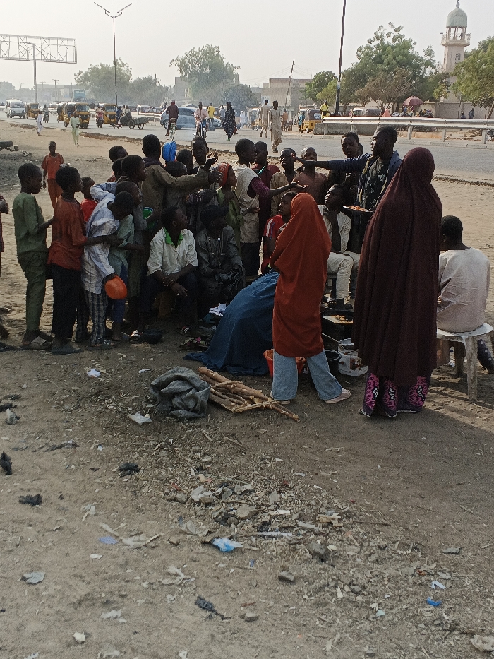 The image captures an outdoor scene in Gobirawa, Nigeria, on dusty, unpaved ground adjacent to a paved road