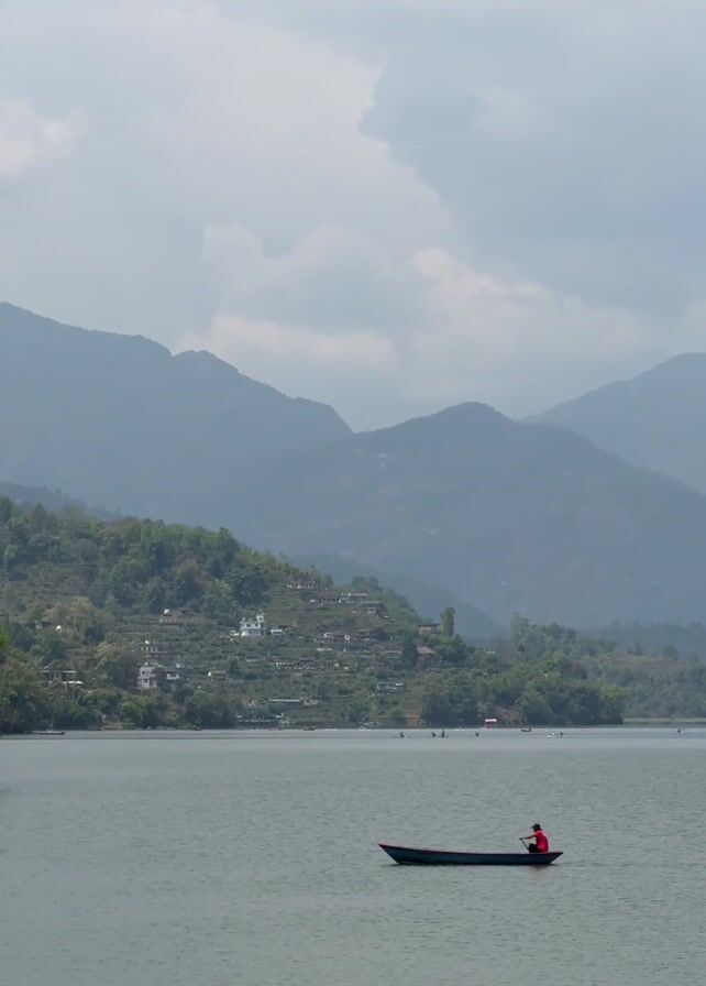 wide shot of a calm lake. In the center is a small, dark-colored boat with a single person in a red shirt sitting in it, using oars to row. Behind the lake is a hillside covered in green vegetation and some houses. In the background, there are hazy mountains obscured by the cloudy sky. The overall light is soft and diffused.
