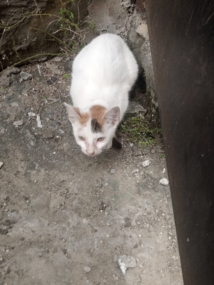 - "A white domestic cat with light brown and dark grey markings on its head is observed standing on a dirt and gravel surface in Mtopanga ward, Kenya" by FM-vsiag2, licensed under CC BY 4.0