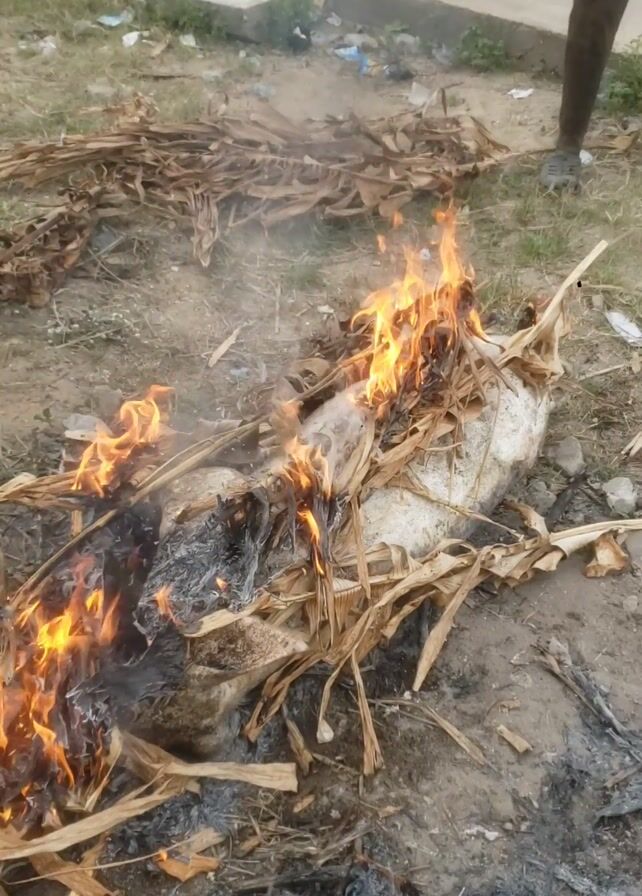 person standing next to a fire on the ground. The fire is burning dry leaves, straw, and other debris around a white object. There is ash and burnt material around the edges of the fire. The ground is dirt with some trash scattered around. In the background there is a concrete surface and a piece of a vehicle visible.
