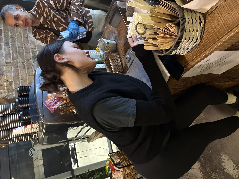 This image captures an interior scene within a cafe in the city of London, United Kingdom, specifically at a service counter. Two adult females are present. In the foreground, a female with dark hair tied back is leaning over a wooden counter, engaged in writing. She wears a black long-sleeved top, a grey t-shirt, a black sleeveless vest, black leggings, and white socks with dark shoes. Her right hand holds a dark pen, poised over a white sheet of paper resting on the counter. A black smartphone displaying "10:30" is positioned to her right. Behind her and to the right, an older female with darker skin and hair tied back stands, looking towards the first individual. She is wearing a brown and beige animal-print jacket over a dark top and light-colored trousers. Both her hands are covered in blue disposable gloves, and she holds a light blue carton, possibly containing milk or a beverage. The counter surface is made of rustic-style wood. On the counter, to the right of the writing individual, is a white wicker basket containing numerous wooden stirrers, white plastic stirrers, and individually wrapped white straws. A white paper sign with "FOOD ALLERGY NOTICE" is taped to the counter's edge. Further back on the counter, a small silver bucket with a rope handle, a clear plastic water bottle, and a small wicker basket are visible. The background features an exposed brick wall. A large dark grey espresso machine, possibly an Astoria model, stands on the counter, topped with stacks of disposable coffee cups (black and white). Shelves behind the machine hold various packaged items in red and orange wrappers. To the far left, a glass window or door reflects interior elements. The flooring appears to be a light-colored, textured surface.
