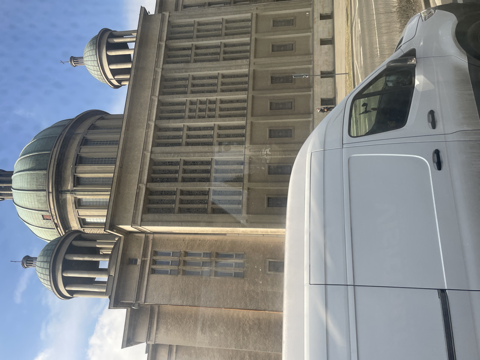 The image displays the Archcathedral Basilica of St. Stanislaus Kostka in Łódź, Poland, under a clear blue sky with scattered white clouds. The cathedral, constructed primarily of light-colored stone, features a large central dome with a green-patinated copper finish, flanked by two smaller, similarly finished domes, each supported by a circular colonnade. The building's visible facade includes multiple rectangular windows, some with discernible gridded or leaded glass patterns, and others appearing as narrow, stacked vertical openings. In the foreground, a white cargo van occupies the lower third of the frame, positioned to the left and obscuring the lower sections of the cathedral. The van's side profile, facing right, displays a sliding side door and the front passenger door with its window. A single individual, dressed in dark clothing, is visible standing on the paved sidewalk between the front of the van and the cathedral's facade, towards the right side of the image. A street light pole is partially visible behind this individual. Sunlight illuminates the scene, casting reflections on the van's body and the building's windows.