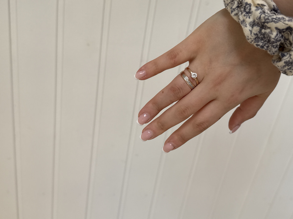 A human left hand is positioned centrally against a light-colored, horizontally paneled wall. The hand displays a French manicure on all visible fingernails, characterized by a clear or light pink base and white tips. On the ring finger (fourth digit from the thumb), two rings are present: a lower, wider gold-toned band featuring a continuous line of small, clear stones, and an upper, thinner gold-toned ring with a single prominent, round-cut clear stone set in a raised bezel. A portion of the wrist, adorned with a patterned fabric scrunchie, is visible at the bottom right. The pattern on the scrunchie consists of dark motifs against a lighter background. The environment suggests an indoor setting within Starokorsunskaya, Russia, specifically against a generic paneled wall.
