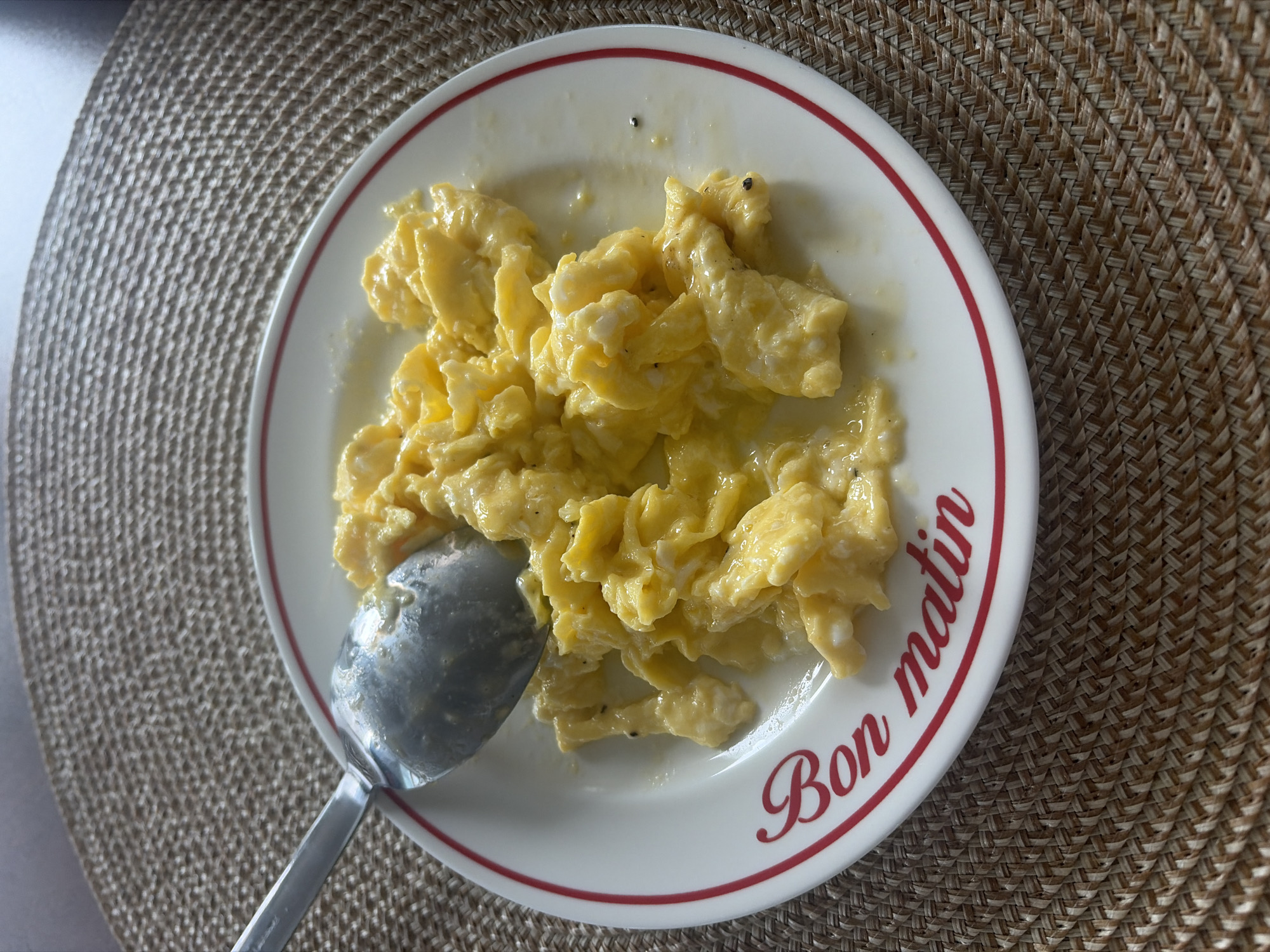 plate of scrambled eggs with a spoon on a woven placemat. The plate is white with a red rim and the French phrase "Bon matin" written on it. The eggs appear moist and slightly undercooked. The spoon is stainless steel and appears to have been used to serve the eggs. The placemat has a woven texture in shades of brown. While the plate indicates a possible connection to French-speaking culture, there is insufficient information in the image to definitively determine that the location is Montreal, Canada.