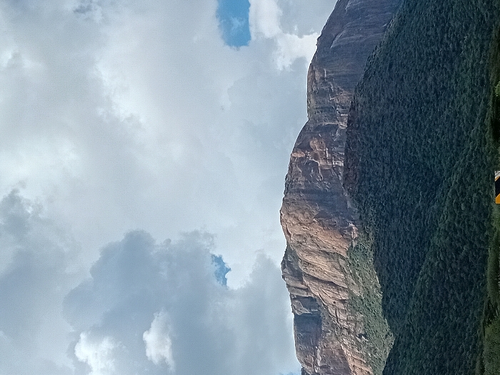 A mountain dominates the view, its face a textured blend of rocky terrain and earthy tones. Lush, green vegetation clings to its slopes. The sky, filled with puffy grey and white clouds, allows glimpses of blue. The image is slightly rotated counter-clockwise, giving it a tilted perspective.