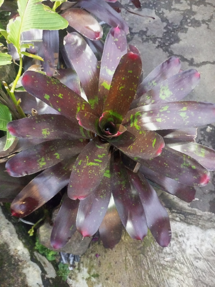 A bromeliad plant dominates the frame, its leaves arranged in a radial pattern. The leaves exhibit a blend of deep purple and brownish-green hues, speckled with patches of vibrant green. At the center, the plant's core showcases a rich, darker tone, with edges tinged in red. Adjacent to the bromeliad, a cluster of green leaves is visible. The plant rests on a weathered concrete surface.