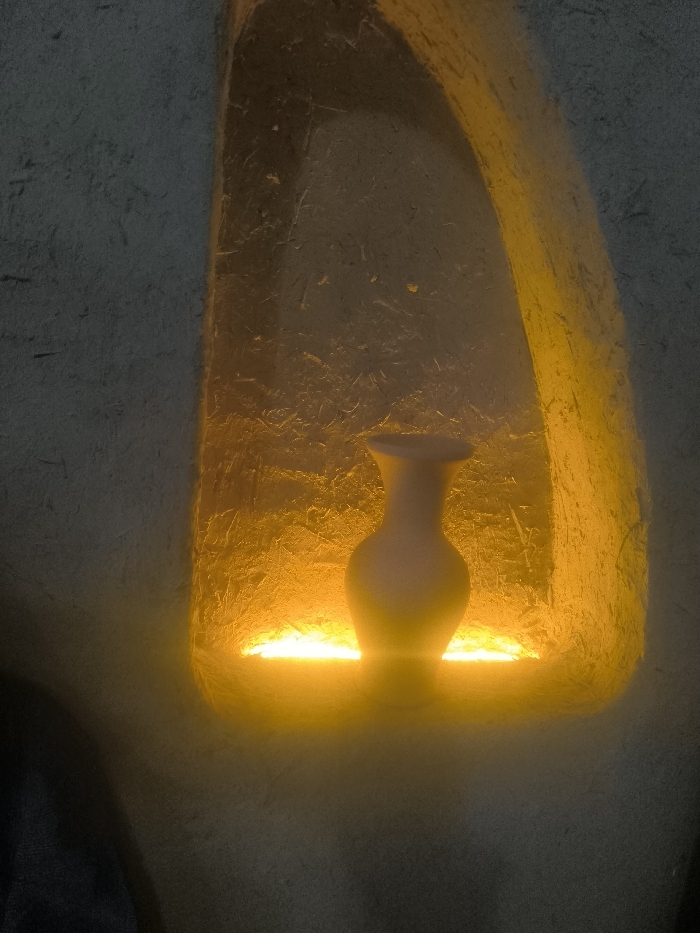 An interior scene in Turkkishlak, Uzbekistan, features a single light-colored, possibly ceramic, vase situated centrally within an arch-shaped wall niche. The vase, characterized by a flared rim and a slightly bulbous body tapering downwards, stands on a flat surface within the recess. The niche is internally illuminated from below by a bright, golden-yellow light source, casting an upward glow that highlights the rough, textured surface of the niche's interior walls. The surrounding wall, visible to the left and right of the niche, is a darker, desaturated blue-gray or dark gray, also exhibiting a rough, earthy texture. No individuals are present.