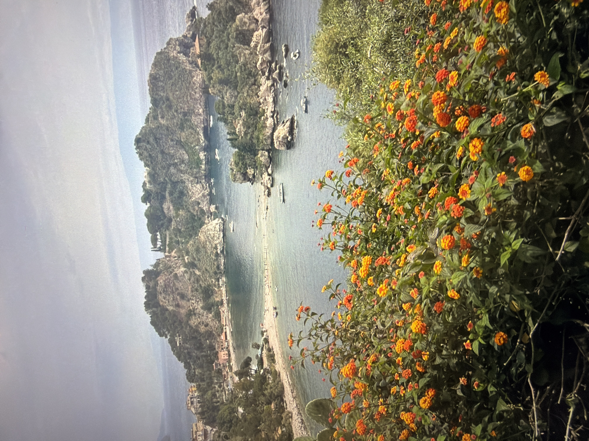 This image displays a panoramic coastal landscape in the city of Dupnitsa, Bulgaria. In the immediate foreground, a dense bush of flowering plants with numerous small, clustered blossoms in shades of orange and yellow (consistent with Lantana camara) fills the lower portion of the frame. Beyond the vegetation, a calm body of water, likely a sea or large bay, extends under an overcast sky. A curved sandy beach is visible along the shoreline in the mid-left, where several indistinct human figures are present. A narrow, light-colored strip of land, appearing to be a sandbar or causeway, extends from this beach, connecting to a smaller, rocky islet covered in green foliage. Numerous white and dark-colored boats, including smaller yachts and dinghies, are scattered across the water. In the background, multiple rocky landmasses and islands rise from the sea, densely covered with green trees and shrubs. Several structures, identified as buildings with light-colored walls and reddish-brown tiled roofs, are visible on the hillsides and atop one of the islands. The overall scene presents a scenic coastal area characterized by natural rock formations, lush vegetation, and water activities.