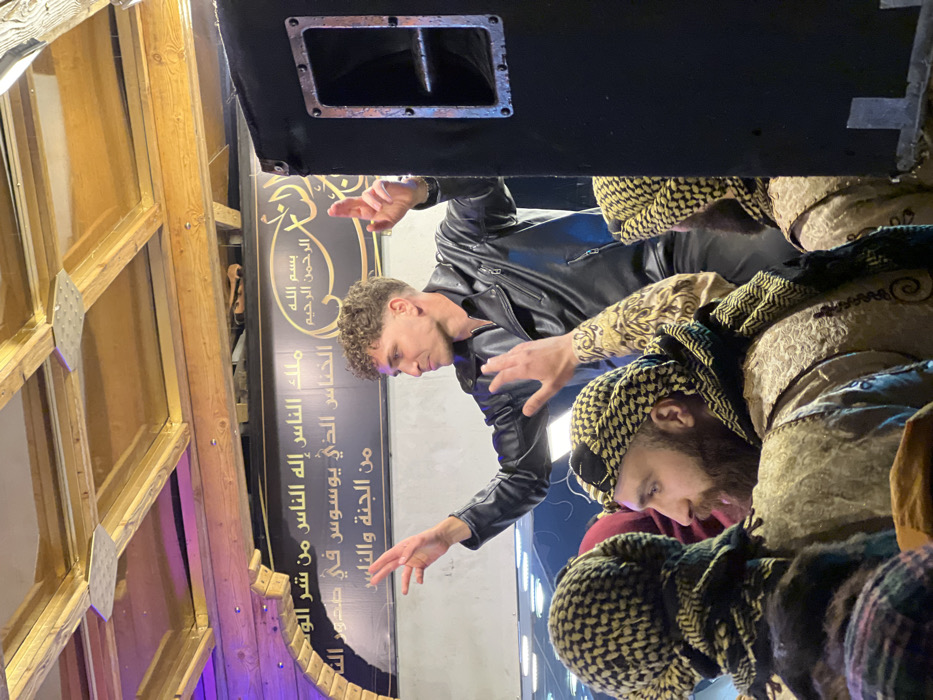 A low-angle shot shows two men wearing traditional Arab head coverings, one with a beard. A fair-skinned man in a black leather jacket stands behind them, his hands posed in what appears to be a gesture of conducting or directing. Behind the trio is a sign with Arabic script in a gold font. Adjacent to the sign is a partially visible wooden structure. A large, dark object with a metal-rimmed opening hangs above the scene.
