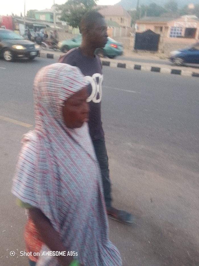 An older woman wearing a striped headscarf and shawl walks alongside a young man dressed in a long-sleeved shirt and jeans. They are traversing a busy street with cars visible in both directions. The scene appears to be outdoors during the day. Buildings can be seen in the background, partially obscured by trees and distant hills. The composition is slightly blurred, and a camera watermark appears in the bottom left corner.