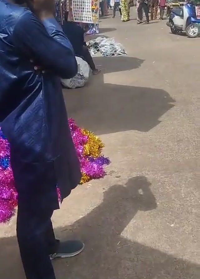 busy street market scene in what appears to be a sunny African country. People walk along the street, while others are stationary, possibly vendors. Many stalls are set up along the sides of the street, under awnings or umbrellas, displaying various goods. Decorations like colorful tinsel are visible. A man in a blue outfit stands at the beginning of the video, then another person is seen riding a motorcycle. Later, a man sits on a large white bag in the middle of the street. The ground is paved, with visible debris such as discarded cloth. The scene is active and reflects a typical marketplace environment.