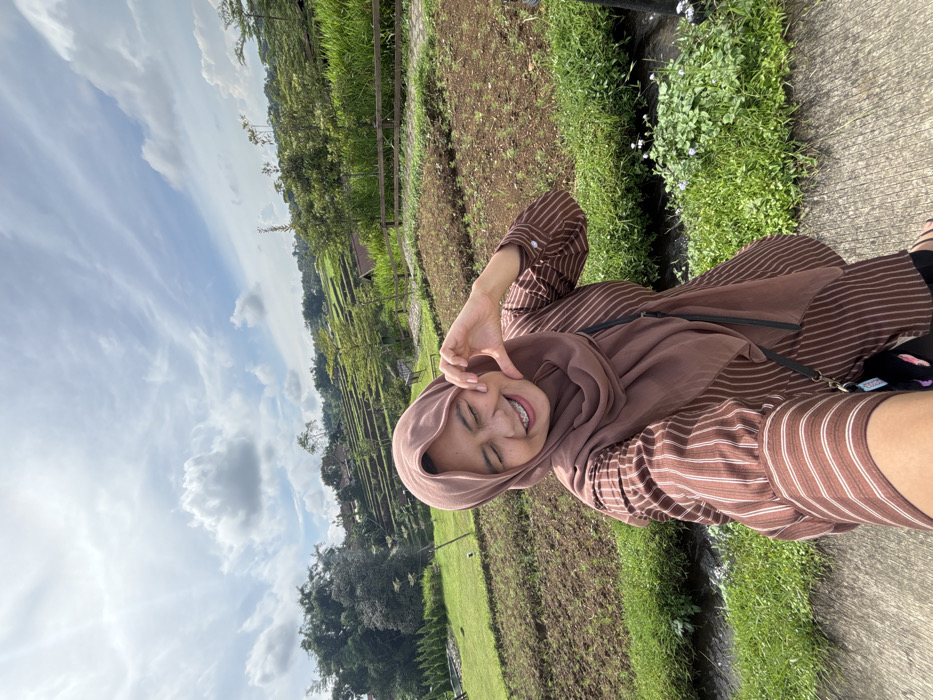 A woman in a brown hijab and striped outfit poses with a heart-shaped hand gesture. She smiles, showcasing her braces. The backdrop features a landscape with tiered rice paddies, green vegetation, and a cloudy sky. A concrete path borders the lush greenery. The photo appears to be taken in daylight, capturing a scenic and cheerful moment.