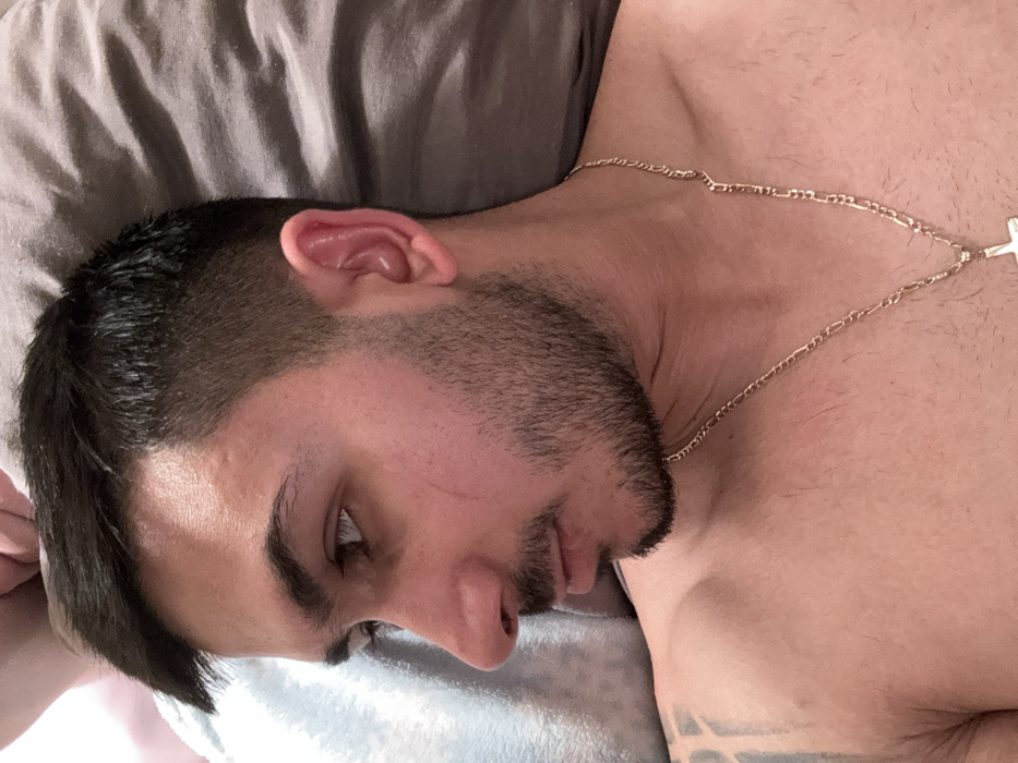 An adult male is depicted in a close-up portrait, lying down in an indoor setting identified as Fowlis Easter, United Kingdom. The individual has short, dark hair with faded sides, a trimmed beard, and a mustache. His head is turned to the viewer's left, and his gaze is directed horizontally. A faint linear mark is visible on his right cheekbone. He is bare-chested and wears a gold-colored figaro chain necklace with a cross pendant. A portion of a dark tattoo is visible on his upper left arm/shoulder. He rests on bedding, with a light blue textured fabric behind his head and left side, and a darker grey/brown textured fabric behind his right side. The background is out of focus.