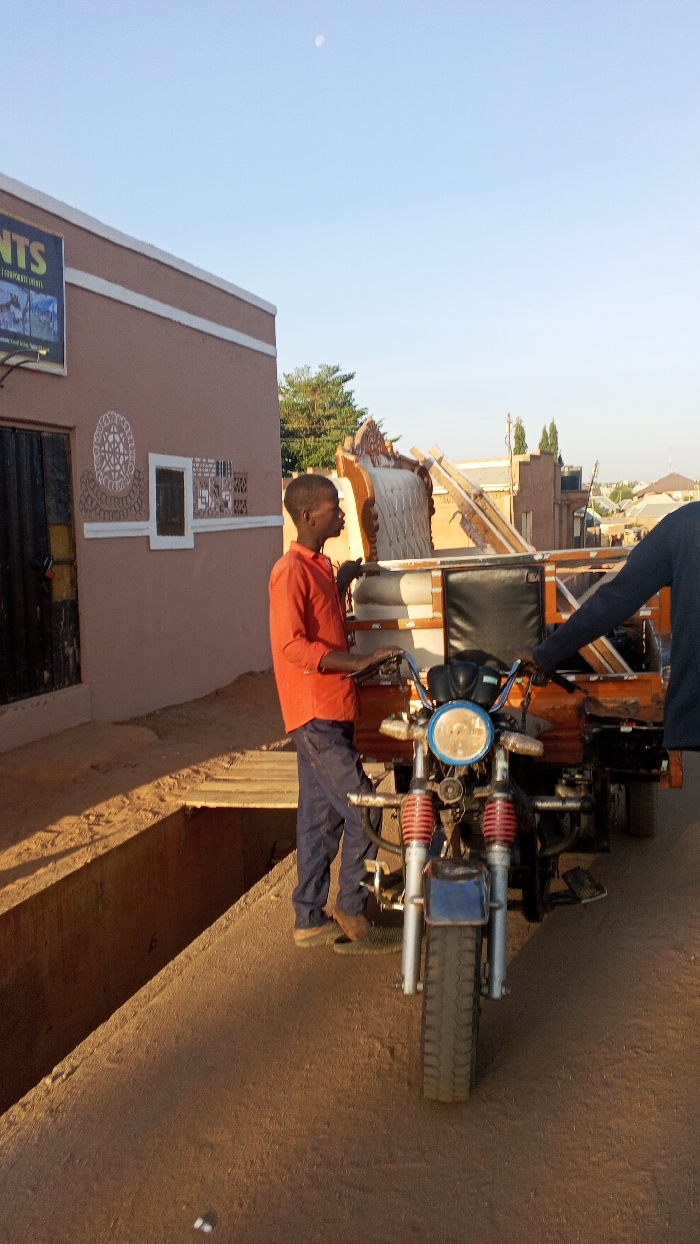 This image depicts a daytime scene on a dirt road in Tempure, Nigeria. A male subject with dark skin, wearing an orange long-sleeved shirt and dark trousers, stands next to the front of a blue three-wheeled motorcycle (tricycle) with a cargo bed, holding its handlebars. A second individual, partially visible on the right, wears a dark long-sleeved shirt and has an arm extended towards the rear of the tricycle. The cargo bed of the tricycle contains a large, ornate wooden furniture item with white upholstery. To the left, a light brown building features white decorative patterns, a dark door, and a partial sign displaying "NTS." A trench runs along the edge of the dirt road in the foreground. The background shows sparse trees and other buildings under a clear, pale blue sky, with a crescent moon visible.