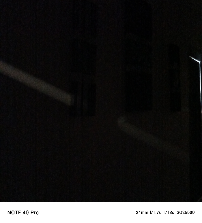 A poorly lit image reveals a dark room with hints of architectural details. Two horizontal beams of light cut across the upper and lower-left corners, illuminating sections of the wall. Towards the right, a brightly lit doorway or window frame sharply contrasts with the surrounding darkness. Vertical elements suggest the presence of window frames or wall features. The image is grainy, revealing the high ISO used.