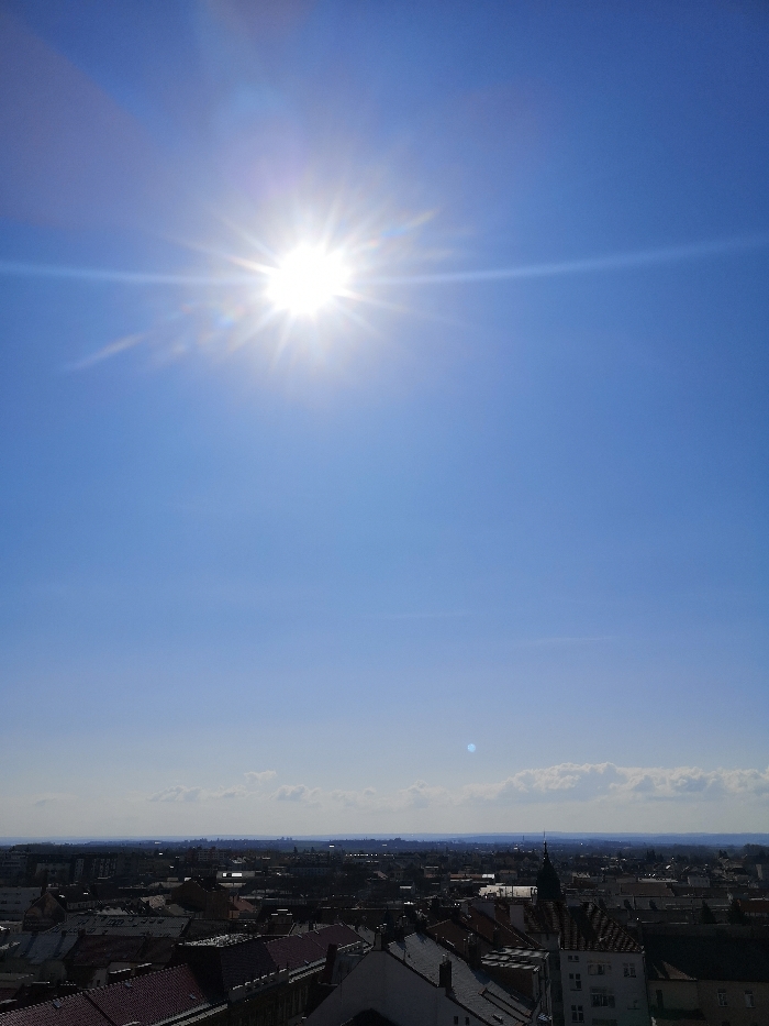The image displays an elevated panoramic view of the city of Pardubice, Czechia, under a clear, bright blue sky. A brilliant white sun, emitting a strong starburst effect and lens flare, is prominently positioned in the upper left quadrant of the frame. The sky, which occupies approximately two-thirds of the image, shows a few sparse, faint white clouds along the distant horizon. The lower third of the scene features a dense urban environment comprised primarily of building rooftops. The structures in the foreground and midground exhibit varied architectural styles, predominantly featuring pitched roofs covered with reddish-brown terracotta tiles, interspersed with darker grey or black roof coverings. A dark, slender, pointed spire, possibly part of a church or historical building, is visible on the right side, rising above the surrounding structures. The cityscape extends into the background, where additional buildings and urban infrastructure are discernible, appearing somewhat indistinct due to distance and atmospheric conditions. No individuals, specific actions, or interactions are present within the frame. The scene is illuminated by direct, overhead sunlight.