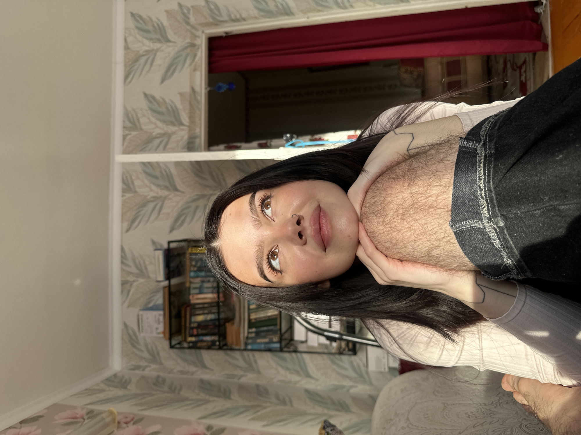 An indoor scene in Aktanysh, Russia, depicts a young adult female resting her chin on her clasped hands, which are placed upon the hairy knee of another individual. The female subject has long dark hair, light brown eyes, a nose ring in her left nostril, and a black line-art tattoo on her left forearm. She is attired in a light-colored, ribbed long-sleeved shirt and gazes upward and to the right. The second individual's leg is covered by dark denim jeans; a bare foot is partially visible on the extreme left. Direct natural light illuminates the subjects from the front-right. The room's walls are covered with two distinct wallpaper patterns: a floral design on the left featuring pink flowers and green leaves, and a repetitive leaf motif on the right. A black metal shelving unit filled with books is located in the background to the left. To the right, a doorway with a white frame is partially covered by a dark red curtain, from which a small blue ornamental object hangs. Beyond the curtain, elements of a patterned rug and indistinct furniture are discernible.