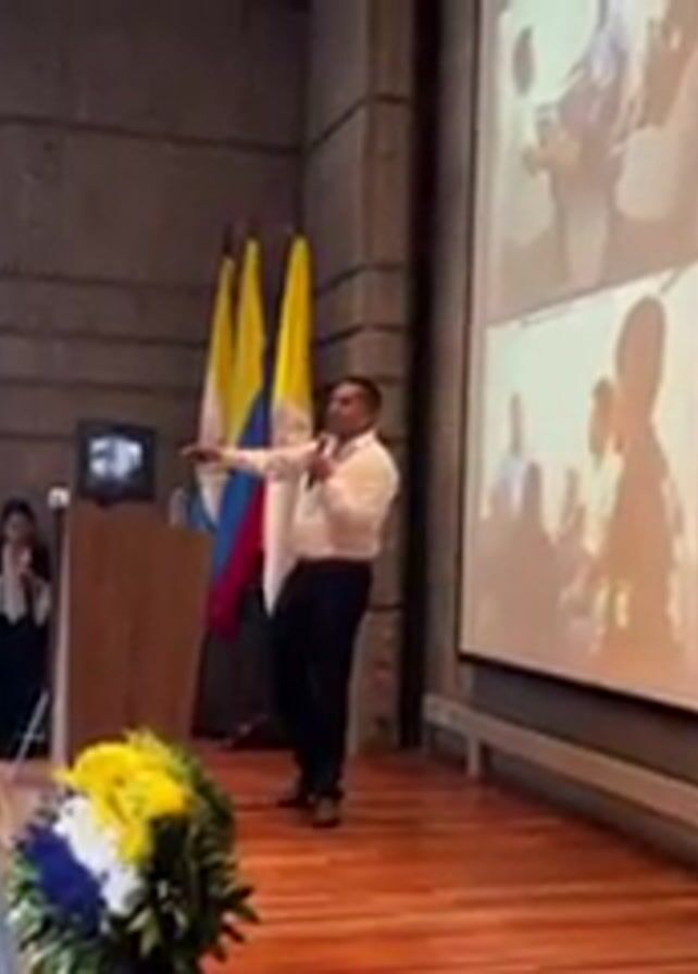 The scene depicts a conference or presentation setting, with a man standing on a wooden stage, addressing a large audience seated in a tiered auditorium. The speaker is dressed in a white button-down shirt and dark trousers, gesturing towards a large screen displaying images and text. Behind him are two flags. An assistant stands near the speaker’s podium. To the left, a man with a camera is filming the event. The auditorium has a window behind the audience, with blinds partially drawn. A floral arrangement sits on the side of the stage. The audience consists of a diverse group of people, attentively listening and some are clapping. The overall atmosphere seems formal and professional.
