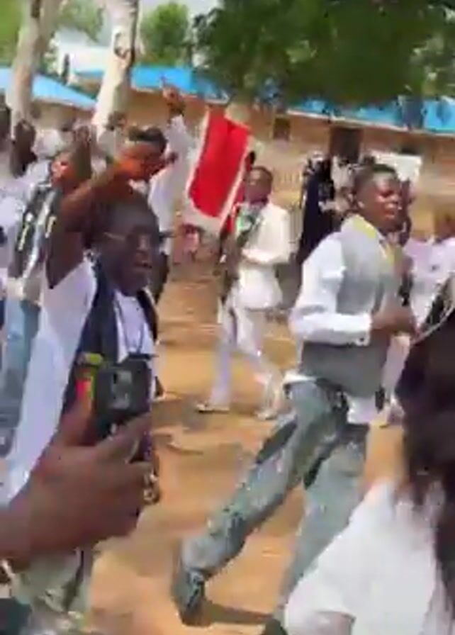 A crowd of primarily young adults are dancing and moving in an outdoor setting. Most are wearing white shirts or jackets over dark shirts, with some wearing graduation stoles. The crowd appears to be celebrating, with many raising their hands and cheering. Some individuals wear traditional hats. The environment seems to be a school campus with buildings visible in the background. Trees are scattered around.