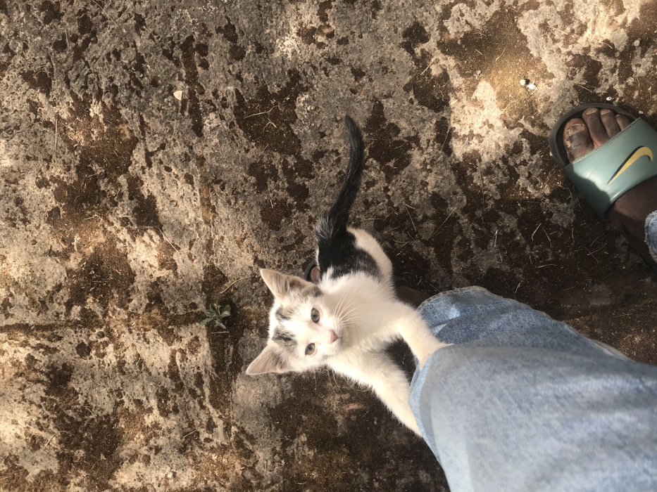 - "This image captures an overhead view of a small, white kitten with black and gray markings on its back, tail, and head, interacting with a human's lower leg and foot on the ground in the city of Jos, Nigeria" by FM-5FVRt1, licensed under CC BY 4.0