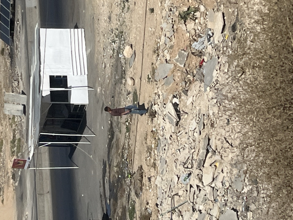 The image depicts an outdoor scene in Al Qutayfah, Syria, under daylight conditions. In the foreground, the ground is covered with a dense layer of light-colored rubble, fragmented concrete, and scattered debris. Sparse, dry vegetation is visible at the very bottom. In the midground, a lone adult male is walking across an uneven dirt path, moving from right to left. He is dressed in a long-sleeved reddish-brown shirt and blue jeans, with his head tilted downwards. The ground around him consists of packed dirt with small stones and incidental trash. In the background, a small, white, freestanding structure with a flat, light-colored roof supported by several white poles is situated on a paved surface. A red and yellow rectangular sign is affixed to one of the front support poles. Behind this structure, a dark asphalt road is visible, bordered by a low concrete barrier. Further back and to the right, a series of dark rectangular solar panels are installed on a higher, arid patch of ground. The distant background features light-colored, barren hills under what appears to be a bright sky, although the sky itself is not visible.