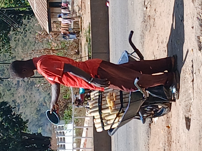 An outdoor scene in Vom, Nigeria, depicts a young man standing in profile to the right under direct sunlight. He wears an orange short-sleeved polo shirt, dark brown trousers, dark sandals, and a light-colored bracelet on his left wrist. His right arm is extended forward, holding a dark, shallow, circular bowl. Immediately in front of him is a dark-colored wheelbarrow filled with numerous pale, elongated items, consistent with roasted corn on the cob, stacked vertically and horizontally. The man stands on uneven dirt ground next to a paved road, separated by a low concrete barrier. In the mid-ground, a white metal railing is visible, followed by dense green foliage and trees. Further in the background to the right, a small building with a corrugated metal roof is present, with clothing hanging on a line nearby. A motorcycle or scooter is partially visible behind the man's left arm. Strong shadows are cast to the right on the dusty ground.