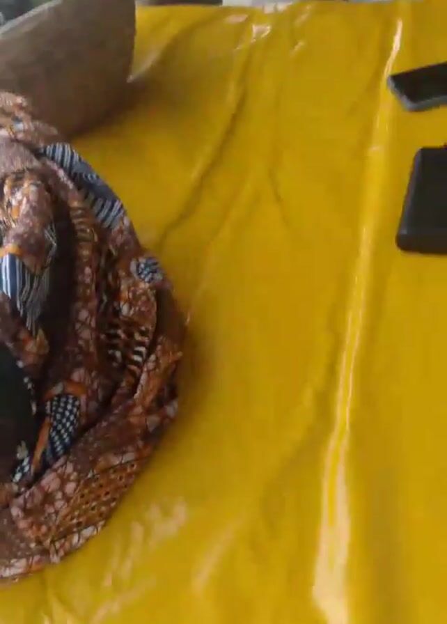 n outdoor market stall in an African village. The stall has a yellow tarp covering the tabletop. A basket filled with green leafy bundles sits next to a pile of round, white food items covered by a patterned cloth. A shirtless man with a red towel draped over his shoulder stands nearby, looking at his phone. Another man is visible in the foreground, looking at the camera. The background reveals a sandy street and simple village buildings.
