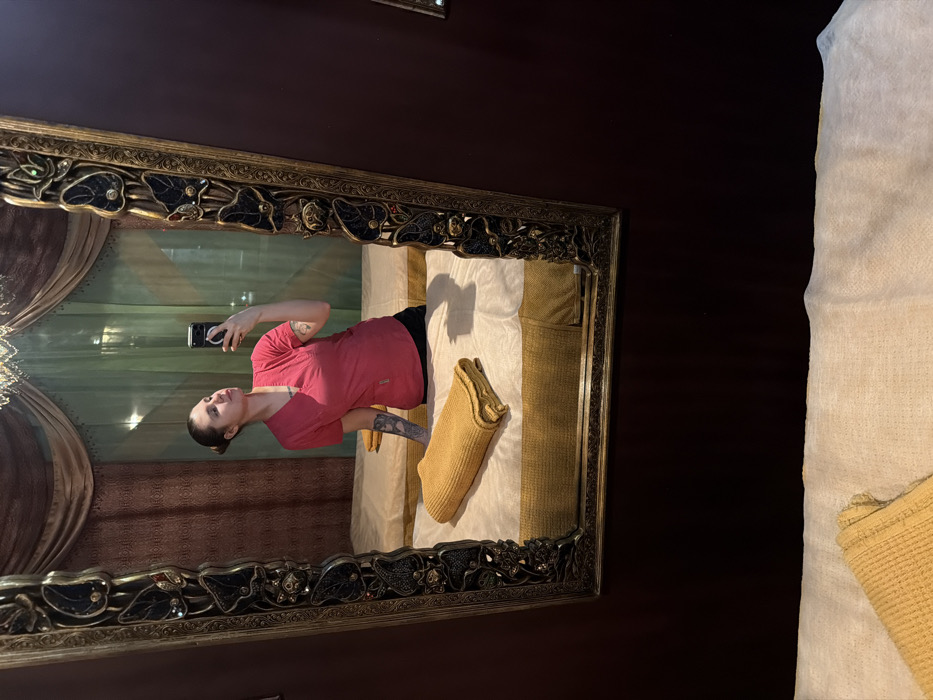 The image displays an interior room, identified as a treatment room within a spa or massage salon in Surgut, Russia. The primary subject is a large, vertically oriented mirror with an ornate, dark gold frame featuring intricate relief patterns. Reflected in the mirror is an adult female, appearing to be in her 20s or 30s. Her hair is styled back, and she is wearing a pink V-neck scrub top and dark-colored lower garments, partially visible. Visible tattoos are present on her left forearm. She is holding a dark-colored smartphone with both hands, positioned to capture a selfie reflection in the mirror. Her gaze is directed towards the smartphone's camera. The reflected environment behind the woman includes two massage beds. Each bed features a gold or mustard-colored base and is covered with a light-colored, possibly white, disposable sheet. A single, mustard-yellow, folded towel is placed on the bed in the foreground of the reflection. In the background, light green sheer curtains are draped, overlaid by heavier, patterned brown or gold curtains. A small, crystal-accented chandelier hangs from the ceiling in the upper center of the reflection. The actual wall surrounding the mirror, not part of the reflection, is a solid dark reddish-brown color. The lighting within the room appears soft and ambient.