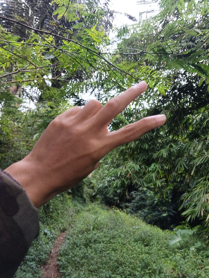 A hand makes a peace sign in front of lush green foliage. The background is a mix of trees, shrubs, and a dirt path. The person is wearing a camouflaged jacket on their left side. The sky is partially visible through the trees. The focus is primarily on the hand gesture, which is crisp and clear.