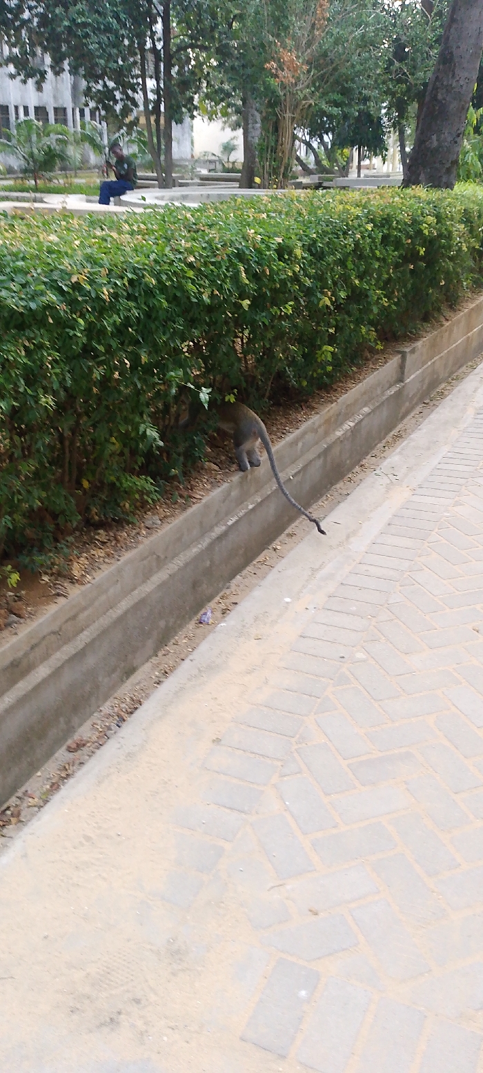 The image depicts an outdoor scene in Tudor ward, Kenya. A light-colored paved pathway, constructed from rectangular blocks arranged in a herringbone pattern and partially covered with sand and dirt, occupies the lower right and center foreground. Adjacent and parallel to this pathway, a concrete drainage ditch runs across the midground. To the left of the ditch, a dense, green hedge separates the pathway from an inner landscaped area. A grey vervet monkey, identifiable by its hindquarters and long, dark tail, is partially visible at the base of the hedge, seemingly stepping into or over the drainage ditch. Its tail extends towards the paved path. In the background, beyond the hedge, a manicured green space features several trees with varied foliage and some bare branches. On the far left, a multi-story, light-colored building with visible windows is present behind the trees. A lone individual, wearing a dark shirt and blue trousers, is seated on a concrete ledge within this landscaped area, observed looking downwards at an object in their hands.