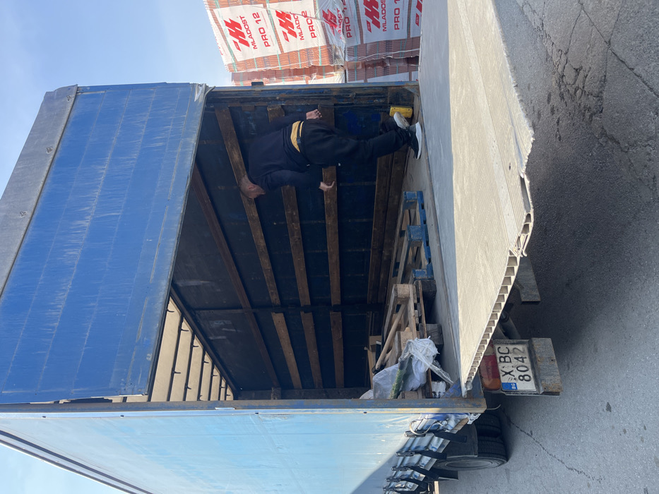 The image displays an outdoor scene in Dupnitsa, Kyustendil Province, Bulgaria, under a clear, bright sky. A weathered blue curtain-side truck trailer is positioned on a paved surface. The rear of the trailer is open, with a metal loading ramp lowered to an approximately horizontal position. A male individual, appearing bald or balding and wearing a dark blue long-sleeve shirt, dark sweatpants with a visible yellow waistband, and dark athletic shoes with white soles, is inside the truck's cargo area. He is bent forward, looking towards the front of the trailer. The interior of the truck is lined with dark material, possibly canvas, and features several horizontal wooden or metal slats for cargo securing. Near the rear opening, on the trailer floor, are several empty wooden pallets, one blue plastic pallet, and a bundle of items wrapped in clear plastic. The truck's Bulgarian license plate, "X BC 8042", is visible at the lower rear. In the background, to the right of the truck, multiple large stacks of building materials are present. These appear to be bundles of red bricks or similar masonry units, wrapped in plastic, with "MLADOST PRO 12" branding visible on their packaging. The ground surface is asphalt, exhibiting some minor cracking and wear.