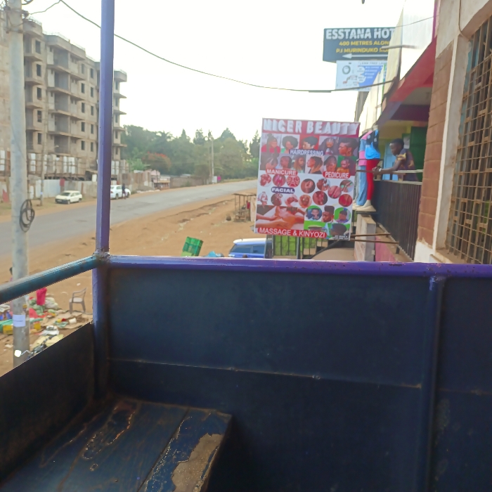 The image presents a street scene in Mathiga, Kenya, captured from a low perspective within a dark blue/purple metallic vehicle bed or container. The immediate foreground shows the interior of this container, including its flat bottom with visible wear and a purple-painted metal frame at its upper edge. In the midground, a two-lane asphalt road with dirt shoulders curves slightly to the left. Two white sedans are parked on the left side of the road. Overhead, multiple utility lines traverse the sky. On the right, a multi-story building features a large, vertically oriented banner advertising "NIGER BEAUTY," detailing services such as "HAIRDRESSING, MANICURE, PEDICURE, FACIAL, MASSAGE & KINYOZI" with illustrative images. Above this banner, a smaller sign for "ESSTANA HOTEL" is visible, indicating its location as "400 METRES ALONG P.J. MURUNDUKO ROAD." Adjacent to the "NIGER BEAUTY" banner, on a balcony, two individuals are present; one wears a light blue top and possibly red pants, leaning against the railing. In the background on the left, a multi-story concrete structure is under construction, displaying exposed floors and support columns. Below this building and near the road, an accumulation of refuse, including plastic items and a white plastic chair, is visible. Distant trees and vegetation line the horizon. The scene is illuminated by natural daylight.
