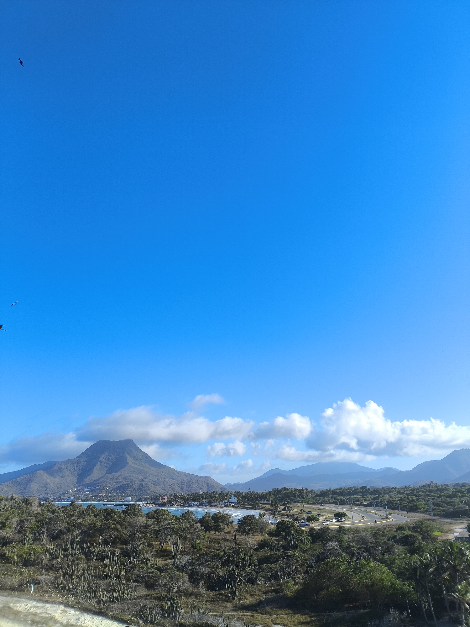 A sunny, daytime, wide shot of a mountainous and coastal landscape. The sky is bright blue with scattered white clouds. There is a mountain at the center, backed by a further range. A road runs along the coastline. The foreground has dense vegetation. In the upper left, there is a bird in flight. The location is possibly in Venezuela or South America, but the city is unknown.