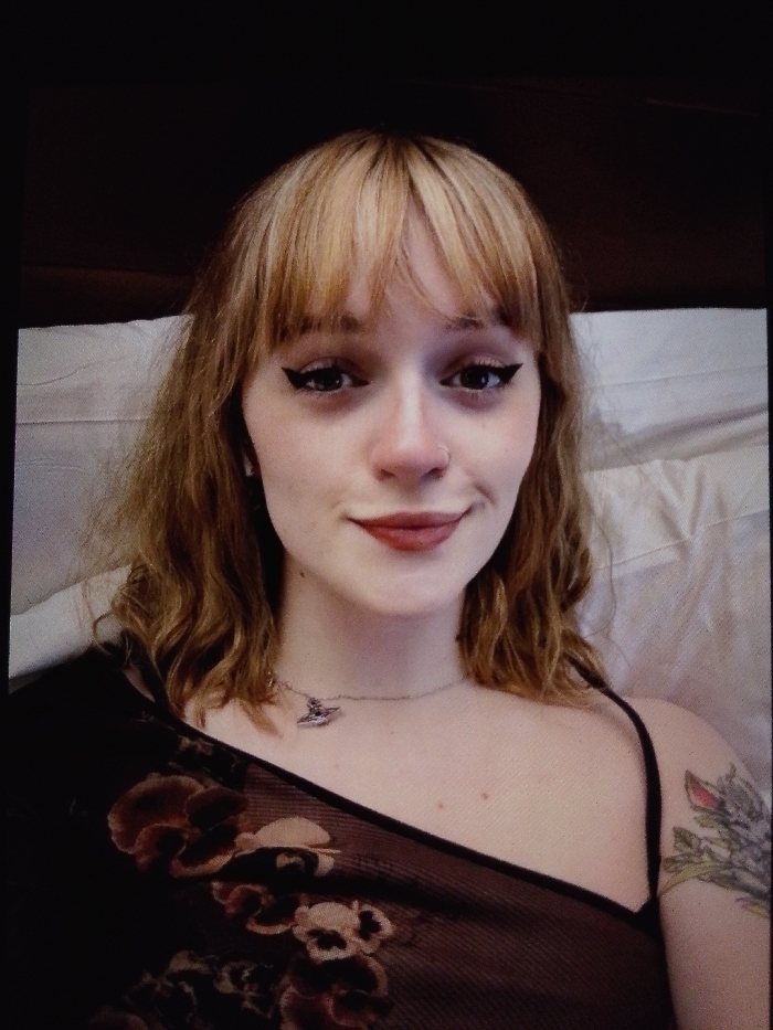 A close-up portrait depicts a young adult female with light skin, shoulder-length wavy dirty blonde hair, and bangs, looking directly at the camera with a slight, closed-mouth smile. She has dark winged eyeliner, a small silver ring in her left nostril, and reddish-brown lipstick. She is wearing a dark, possibly sheer, top adorned with brown floral patterns. A thin black strap is visible on her left shoulder. A silver chain necklace with a small orb-shaped pendant rests on her collarbone. A colorful tattoo, featuring green and red tones, is visible on her upper left arm. The background is softly out of focus, showing a light-colored, textured surface, likely bedding, behind her, and a darker, indistinct surface above her head. This scene is located in the city of Lares, United States of America.
