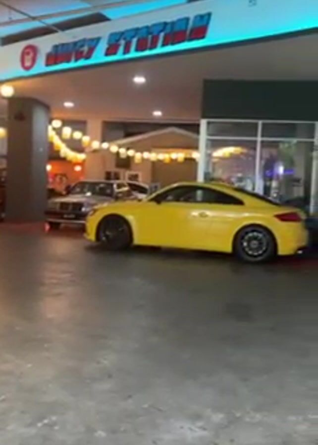 several parked cars under an overhang labeled "Juicy Station." The cars include an orange jeep, a silver sedan, a yellow coupe, a white hatchback, and a gray coupe. The area is lit with string lights and ceiling lights, and the floor is gray concrete. The overhang appears to be part of a building or structure. The camera slowly pans from left to right, showcasing the cars parked.
