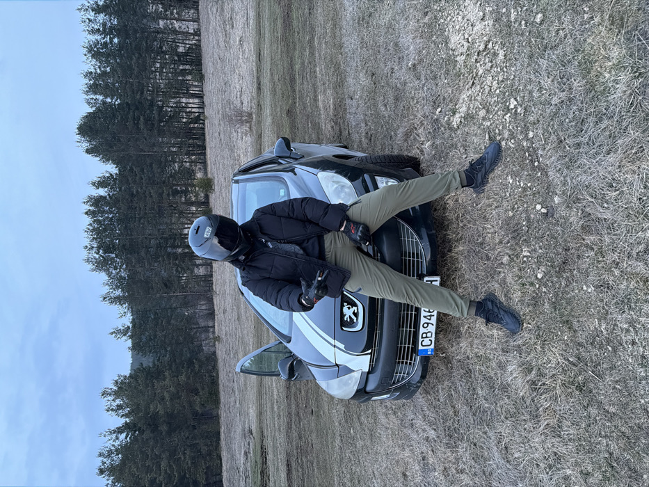 A single individual is depicted posing on the front hood of a dark-colored Peugeot 407 car. The person is wearing a black full-face motorcycle helmet with a dark visor (featuring an "AGV" logo), a black puffer jacket, olive green pants, black socks, and black athletic shoes. Black motorcycle gloves with red accents are worn on both hands; the right hand is extended forward, performing a gesture with extended thumb, index, and pinky fingers. The car has two white racing stripes down its hood and front bumper, and its front driver-side door is open. A Bulgarian license plate, "BG CB 9466 AH," is affixed to the front, indicating registration in Sofia. The vehicle is situated on a dry, unpaved area covered with sparse, light brown/grey grass and some scattered ground debris. In the background, a dense line of coniferous trees forms a forest under an overcast, light blue-grey sky. The specific location within Plana, Bulgaria, is not discernible from the image, but the environment suggests a rural or natural setting.