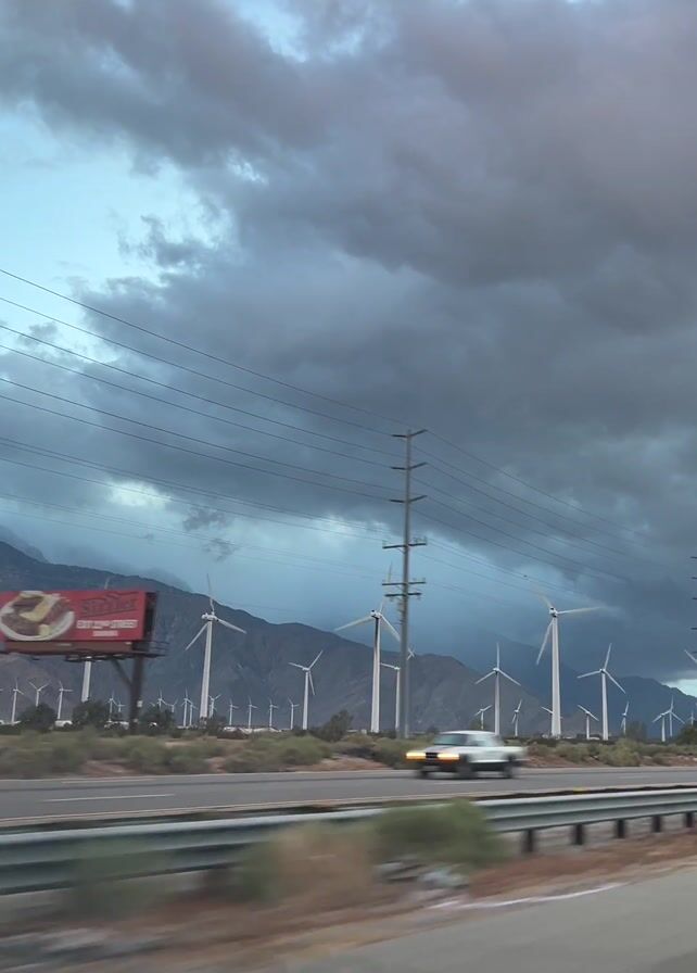 The video depicts a landscape featuring numerous wind turbines set against a backdrop of dark, cloudy skies and mountains. The view is taken from inside a moving vehicle, with the dashboard visible at the bottom of the frame. A highway stretches horizontally across the middle ground, separated from the wind turbines by a grassy median strip. A billboard is visible behind the turbines on the left side of the frame. Power lines extend across the top portion of the video, connecting the wind turbines to the electrical grid.