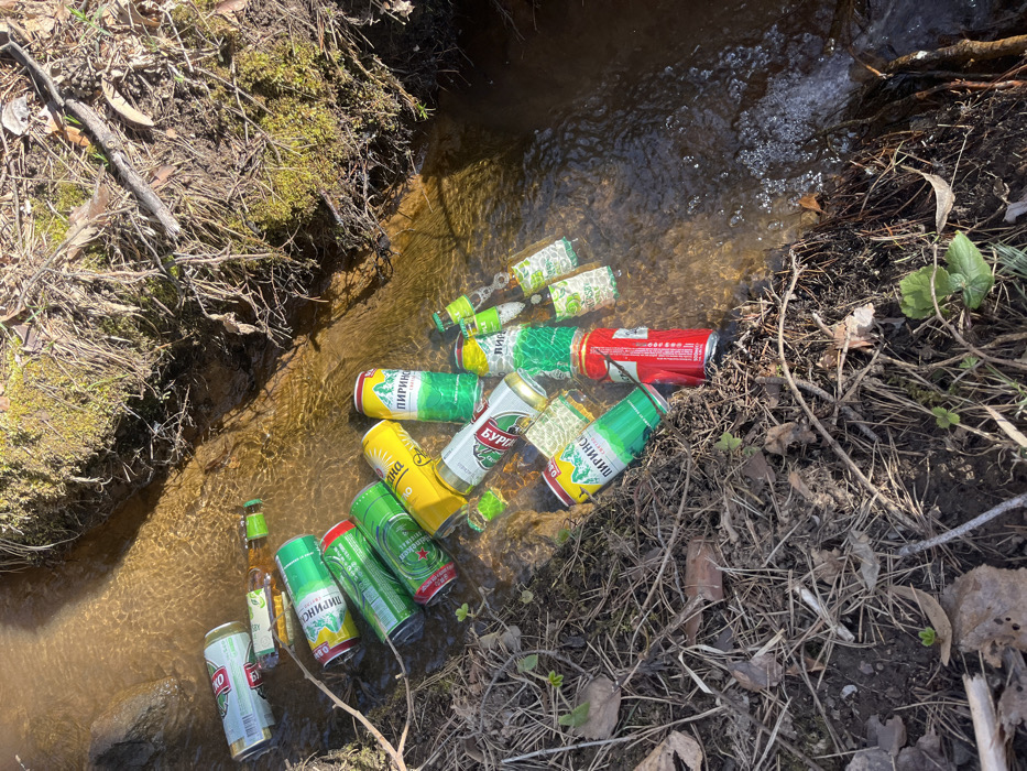 This image depicts a natural waterway approximately 1-2 meters wide, located near Vladaya, Bulgaria, containing numerous discarded beverage containers