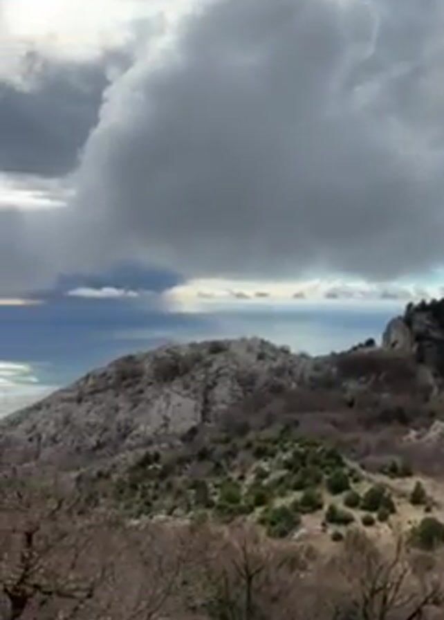 The video opens with a view of a rugged, rocky, sparsely vegetated landscape under a heavy, overcast sky. A telecommunications tower is visible on a nearby hilltop. The camera pans upwards and forwards to reveal a view of the sea, which is choppy and reflects sunlight in shimmering patterns. The horizon is visible as a thin line between the dark sea and the cloudy sky. Bare branches of trees are visible in the foreground.