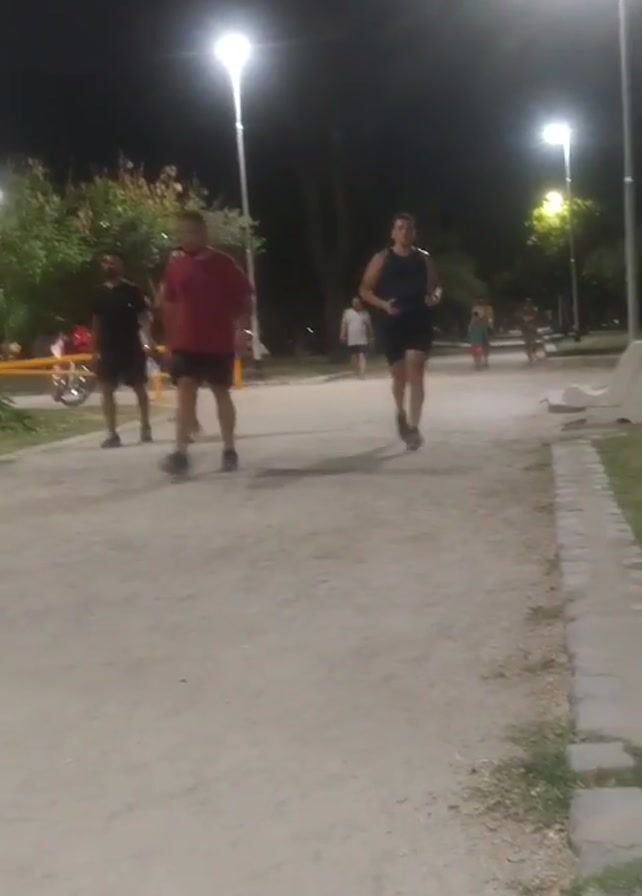 several people exercising in a park at night. The scene is illuminated by bright street lights. A person in a grey tank top and black shorts jogs towards the camera. Behind them, two men walk in the same direction. One wears a red shirt, and the other wears a black shirt. In the background, several other people can be seen walking or standing further down the path. The path is made of compacted dirt, and a low concrete curb runs along the edge. A tree is partially visible to the left of the path. In the distance, there are other trees, street lamps, and park benches. The scene appears calm and safe.