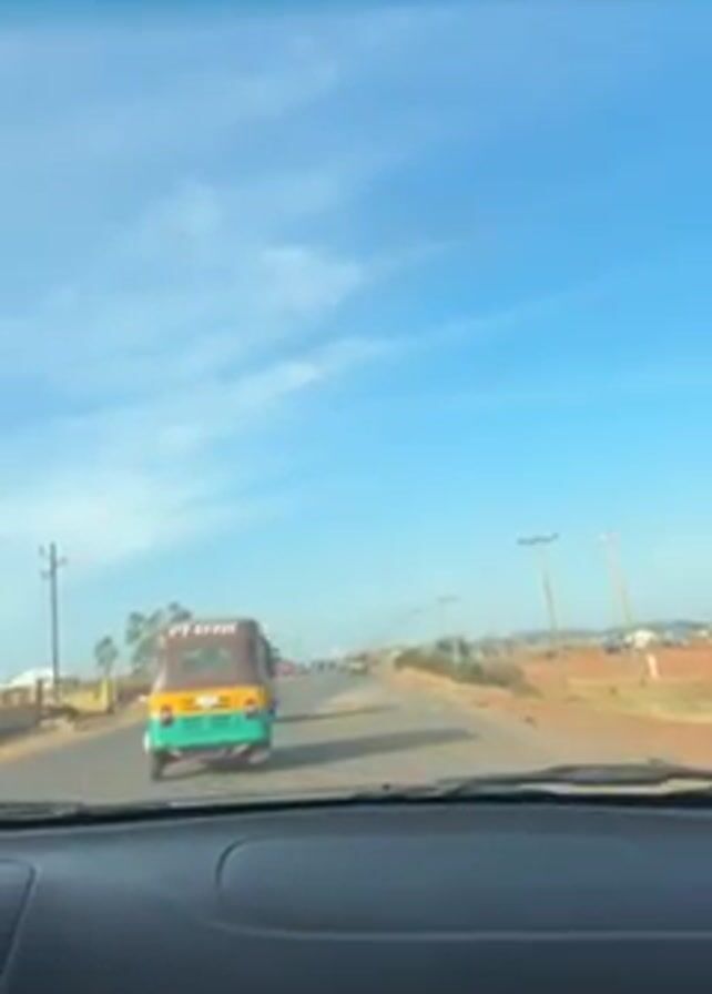 The video, shot from the dashboard of a car, depicts a road on a clear day with a blue sky and some wispy clouds. Several three-wheeled vehicles, commonly known as tuk-tuks or auto-rickshaws, are seen driving ahead. The road appears to be somewhat rural, with sparsely vegetated land on either side and utility poles lining the route. The car moves steadily along the road, maintaining a distance from the tuk-tuks in front.