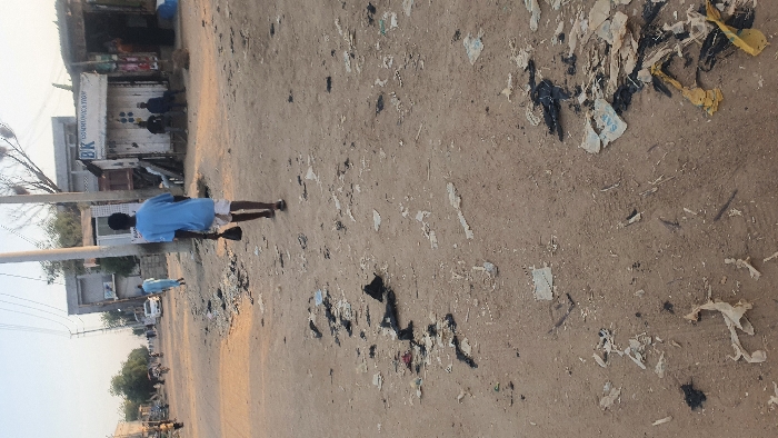 A street scene reveals a dirt road littered with various trash, including plastic bags and paper scraps