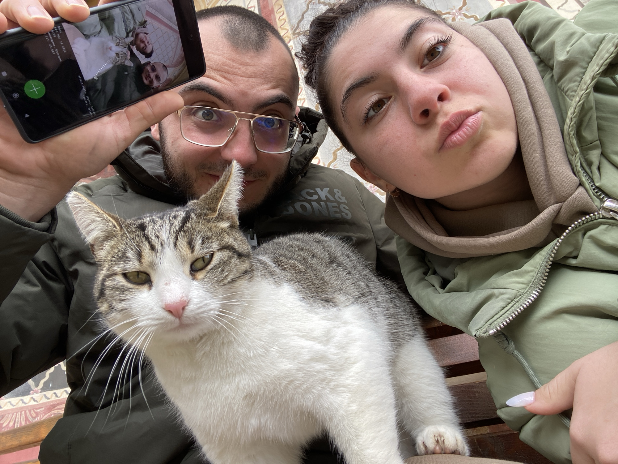 A man and a woman take a selfie with a cat. The man on the left side of the image is holding up his cell phone, which shows another picture of him, the woman, and the cat in a similar position. The man is wearing glasses and a dark green jacket with the text "JACK & JONES." The woman on the right side of the image has a hooded jacket with a light green outer layer and a beige inner layer. She is making a kissing face. In the center is the white and grey tabby cat looking forward. The text on the phone indicates that the photo on the phone was taken in Samovodene, Bulgaria.
