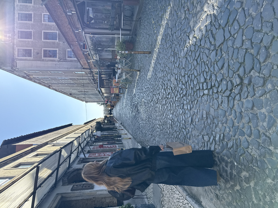 The image depicts a sunlit cobblestone street, characteristic of Lisbon, Portugal, specifically resembling a pedestrian thoroughfare within the LxFactory district. The street is lined with multi-story buildings housing various businesses. In the foreground, slightly to the left and seen from behind, is an individual with long, wavy blonde hair. They are wearing a black leather bomber jacket with a ribbed hem and cuffs, dark wide-leg trousers, and light-colored flat shoes. They carry a plain brown paper shopping bag in their right hand, held at their side, and a dark bag is visible on their left hip, partially obscured by the jacket. The individual's head is turned slightly to their right, looking down the street. The street itself is paved with irregularly shaped dark grey cobblestones (calçada portuguesa), with a narrower strip of patterned white and dark cobblestones forming a sidewalk on the left. Long shadows from structures on the right side of the street extend across the cobblestones. On the left side of the street, multi-story buildings with light-colored facades feature ground-floor businesses with awnings, signs, and display items. On the right side, a tall, grey industrial-style building, likely a converted factory or warehouse, dominates the view. Its ground floor is occupied by numerous outdoor restaurant or cafe seating areas, furnished with white metal tables and chairs arranged on the cobblestones. These areas are partially covered by awnings and enclosed by glass panels. Potted plants, including small trees, are visible as decor. Dark metal bollards separate the seating areas from the main thoroughfare. Further down the street in the distance, a few other individuals are discernible, suggesting ongoing pedestrian activity. The sky overhead is clear and bright blue, with a sun glare visible in the upper right corner, indicating direct sunlight.